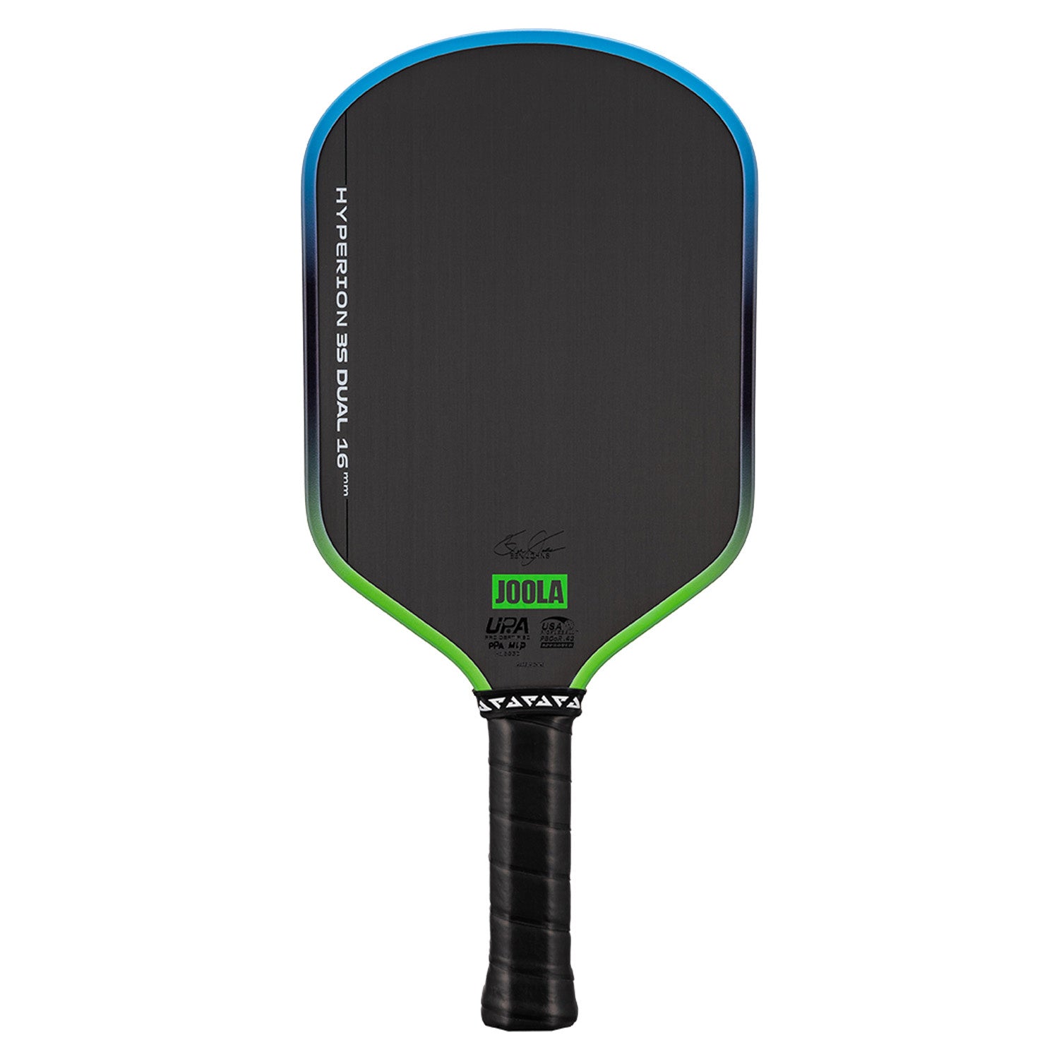 The Hyperion 3S Dual is finished with a distinctive blue and green dual-color gradient along the edge guard, bringing updated performance and a signature JOOLA look to this proven paddle shape.